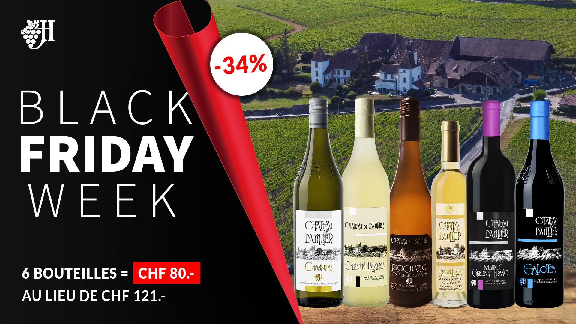 Nous vous offrons une remise de 34% pour le Black Friday sur 6 vins du Château de Duillier, présentés dans un élégant coffret de dégustation. Offre limitée. Dans la limite des stocks disponibles. Livraison dans toute la Suisse ou retrait au Château de Duillier où nous vous accueillons avec un verre de vin chaud.